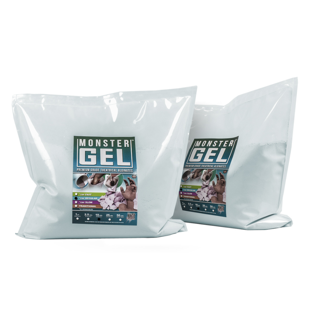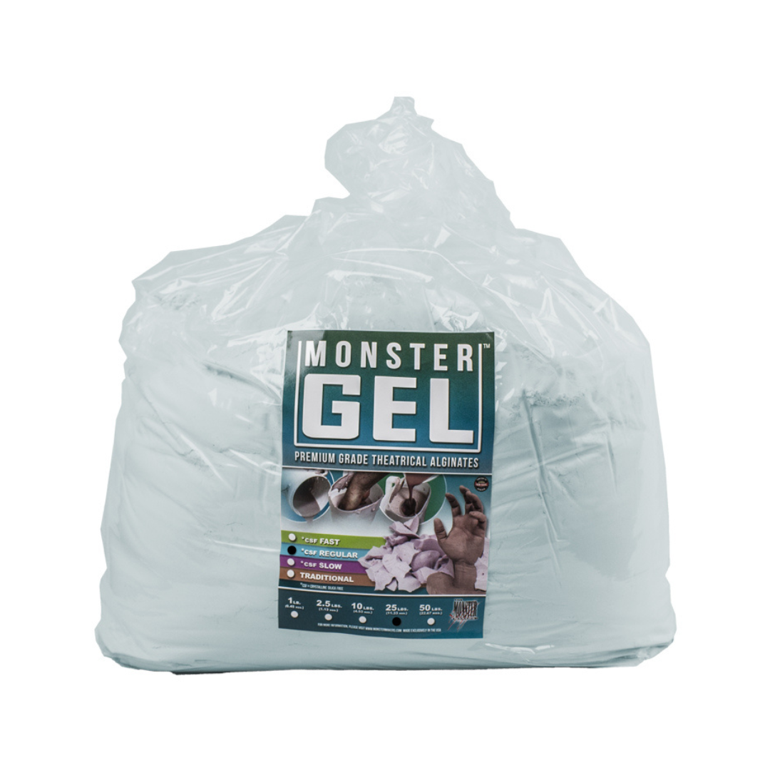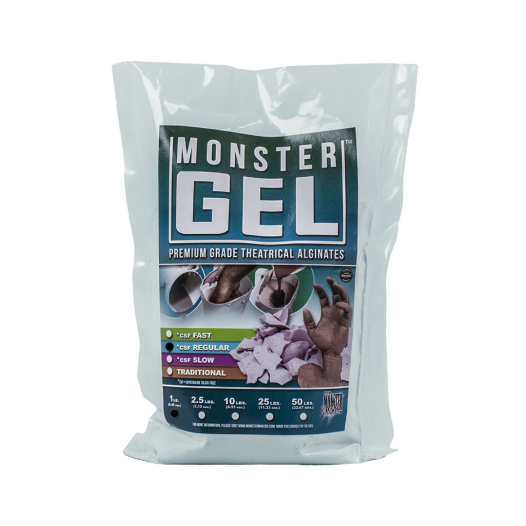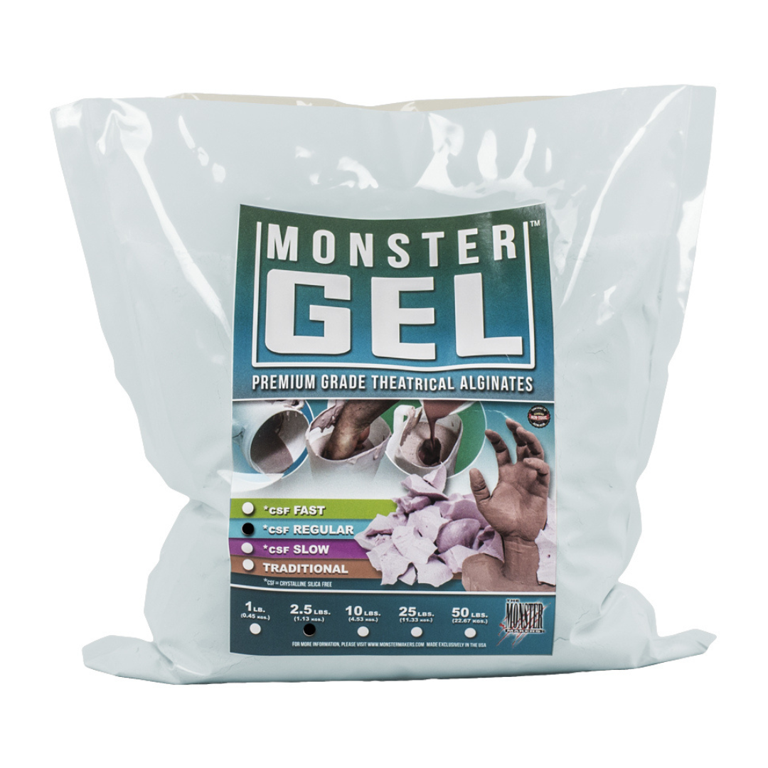 Monster Gel CSF Regular is the newest Prosthetic Grade Alginate from our friends at Monster Makers. This product comes from their range of new warm water set, alginates that mix easily to very creamy consistencies by hand. The CSF in the name stands for crystalline silica free. The ideal water temperature for this product is 90° Fahrenheit or 32° Celsius. The regular 4-5 minute set time allows for efficient moulding of medium size projects such as head and limb casts. Please note that this alginate should not be mixed with cold water. They are formulated to work with warm to very warm water. Cold water mixes can result in very slow and weak setting batches.