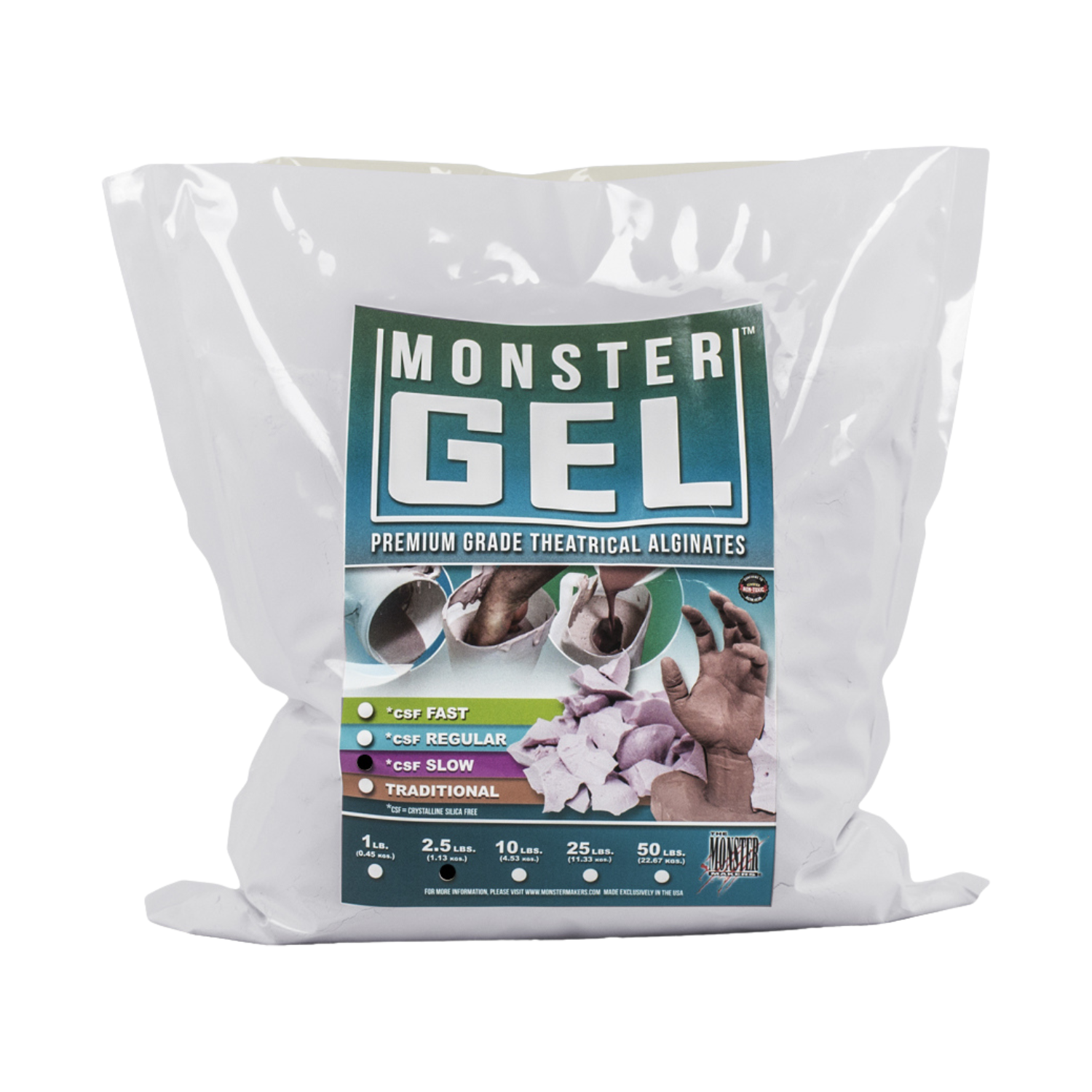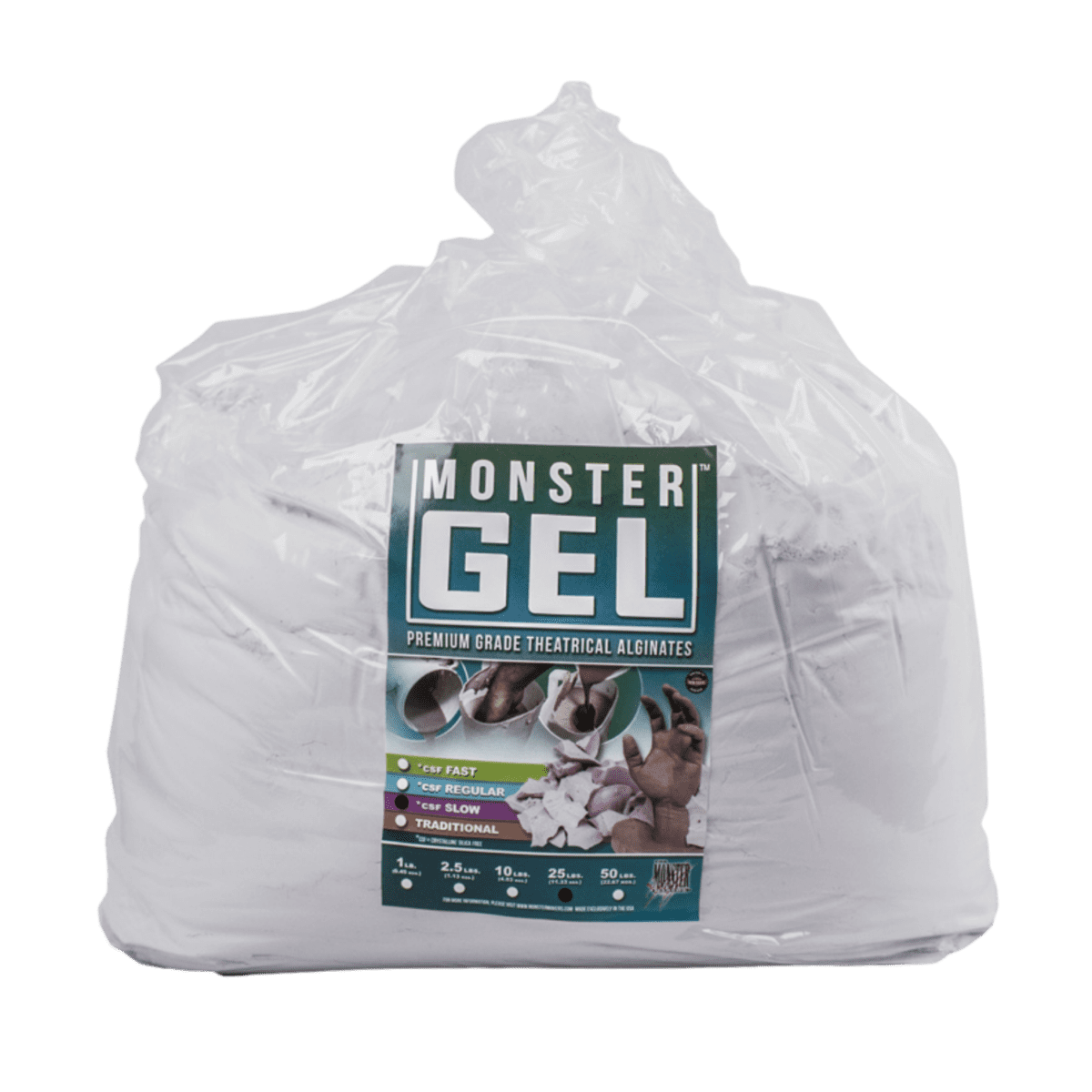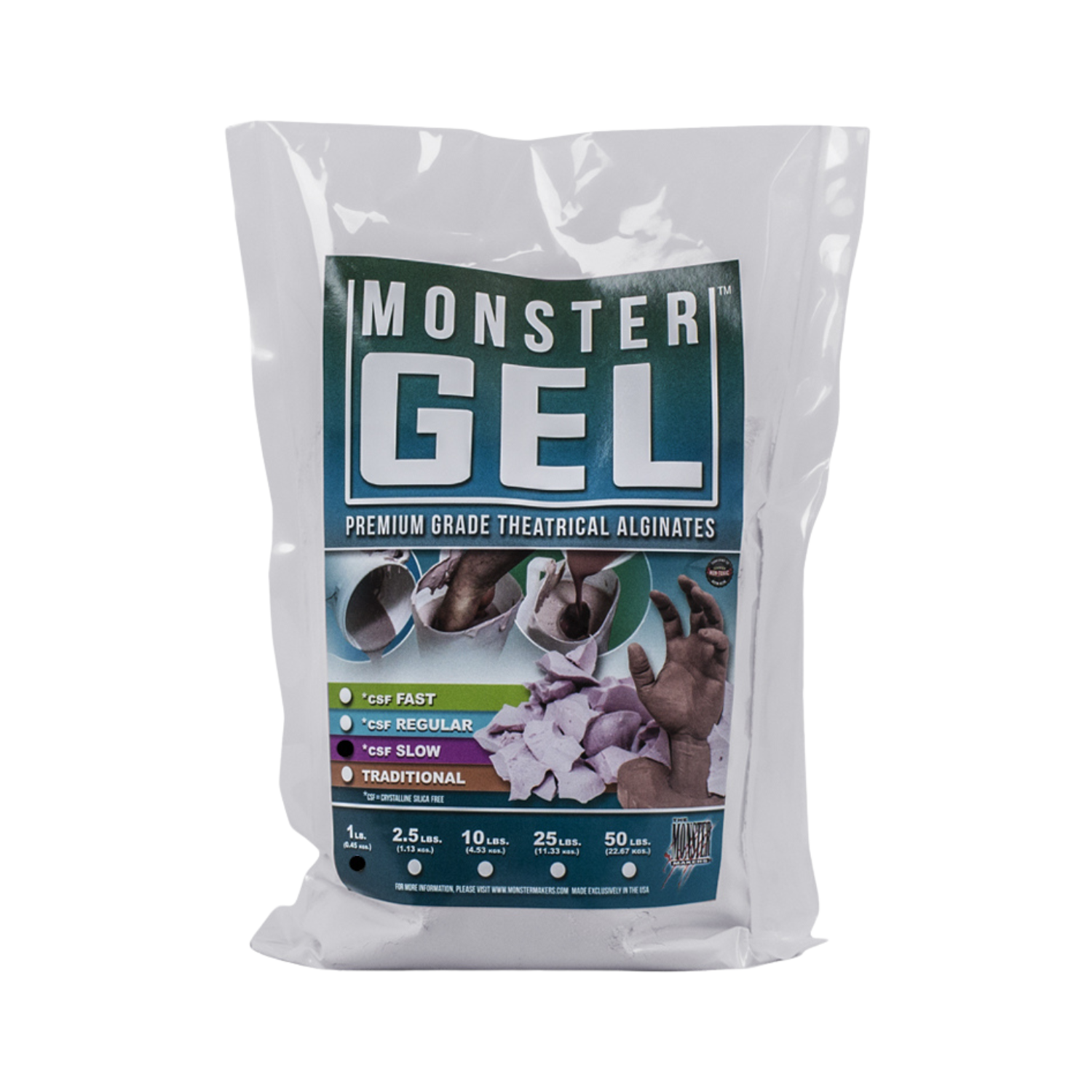 Monster Gel CSF Slow is the newest Prosthetic Grade Alginate from our friends at Monster Makers. This product comes from their range of new warm water set, alginates that mix easily to very creamy consistencies by hand. The CSF in the name stands for crystalline silica free. The ideal water temperature for this product is 90° Fahrenheit or 32° Celsius. The slower 7-8 minute set time allows for efficient moulding of larger projects such as head and body casts. Please note that this alginate should not be mixed with cold water. They are formulated to work with warm to very warm water. Cold water mixes can result in very slow and weak setting batches.